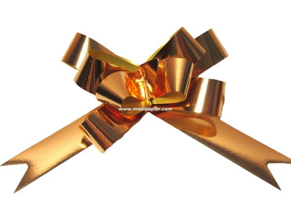 100 stuks metallic opschuifstrikken uit 19 mm goud lint. Een mooi forse strik van 9 cm doorsnede. Deze strikken laten zich zéér makkelijk opschuiven en stropen niet.