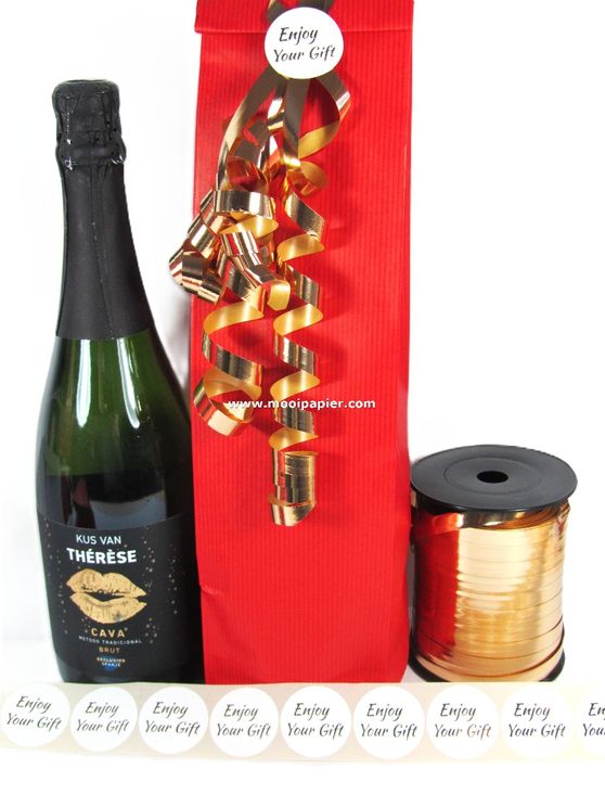 100 stuks wijn zakken rood met blokbodem. Formaat 10 x 39 cm + bodem van 10 x 8 cm. Deze rode wijnzakken worden geleverd met 1 rollen goud metallic krullint + 500 etiketten *gratis*