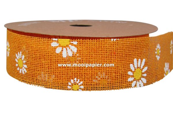 Jute band 45 mm breed x 20 meter lengte. Dit jute band is ingekleurd en bedrukt met margrietjes. Zeer decoratief op bruin kraftpapier.